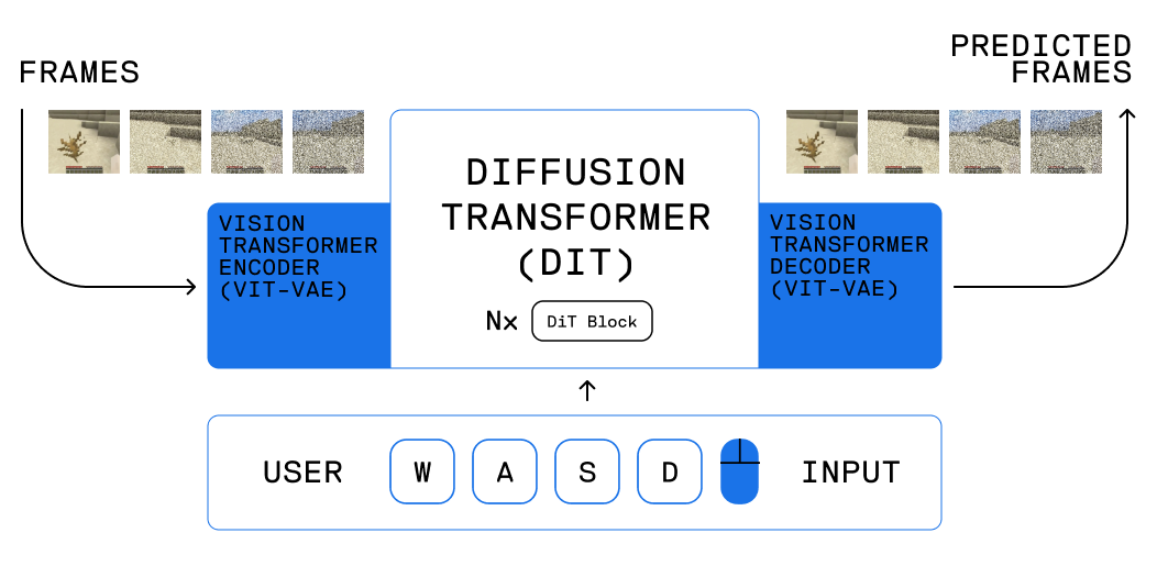 Oasis is an interactive world model developed by Decart and Etched. Based on diffusion transformers, Oasis takes in user keyboard input and generates gameplay in an autoregressive manner. We release the weights for Oasis 500M, a downscaled version of the model, along with inference code for action-conditional frame generation.