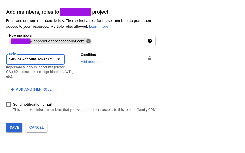 Additionally, you may need to add the Service Account Token Creator role to the service account used by your cloud functions. This will give them permission to generate signed URL policies for file uploads and downloads. To do this, visit the IAM (identity and access management) page in the cloud console. In the list of service accounts, search for the account named "App engine default service account". Then, select "add" at the top of the page and under "New members", start typing and select the account you just found. Finally, select Service Account Token Creator for the role and click save.