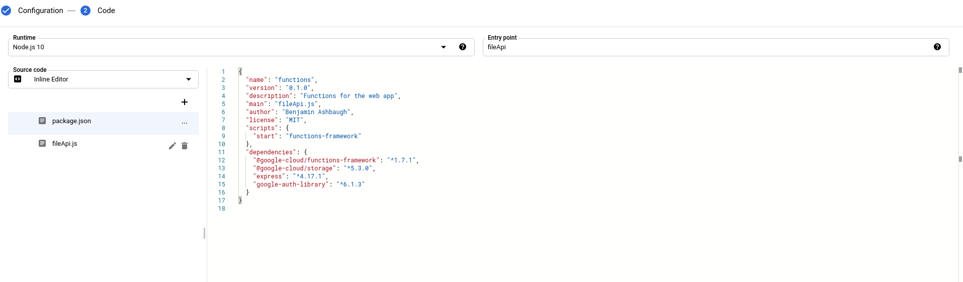 You can clone this repo now and get the two small files from the /functions directory, or you can just copy and paste the two files from here: package.json, fileApi.js. Also, make sure to set the entry point to fileApi.
