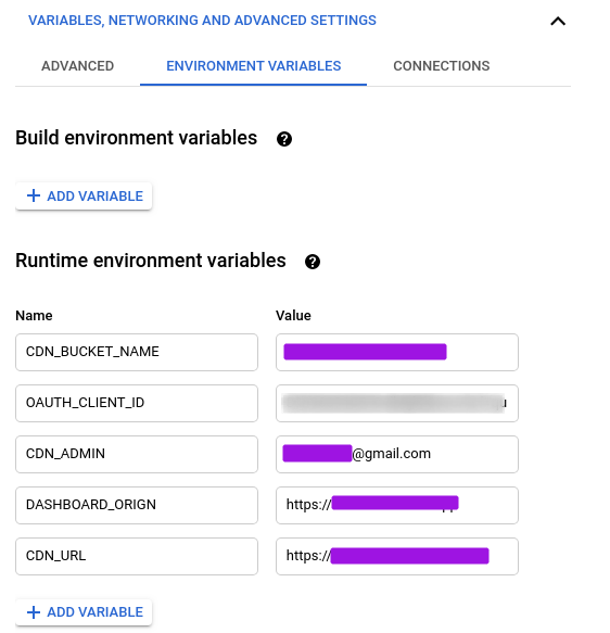 OAUTH_CLIENT_ID- Your app's OAuth client ID from the authentication stepCDN_ADMIN- The email of your google account. You will be able to add additional CDN admins through the settings page in the app later.CDN_BUCKET_NAME- The cloud storage bucket (in the same GCP project) where you want to store your files.CDN_URL(optional) - The base URL to the CDN frontend for your bucket (without an ending slash):https://cdn.example.com. If you don't have a CDN subdomain you can leave it blank or set it tohttps://bucket-name.storage.googleapis.comDASHBOARD_ORIGIN(optional) - This is used to set your bucket'sAccess-Control-Allow-Originheader. If you want to block websites (other than the file manager) from fetching files from your bucket, set this to your file manager's URL (including protocol, excluding path). Otherwise, leave it blank to allow all origins.