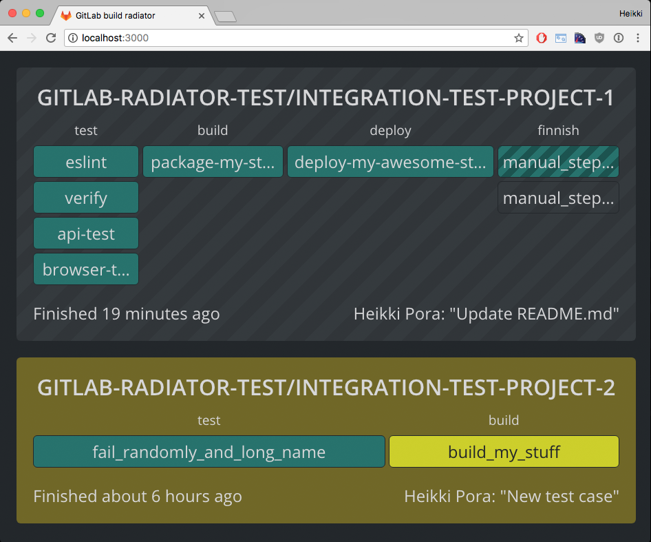 gitlab-radiator is a small Node.js application for serving a Jenkins Radiator View inspired web view of your team's CI pipelines fetched from a GitLab CI installation running locally or remotely.