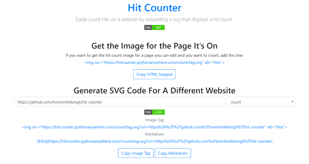Going to the location / on the server, you will be served with an HTML page that contains a tool to create the image tag or markdown element and search up a websites count.