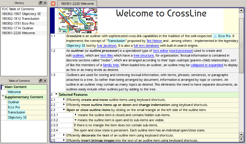 CrossLine is an outliner with sophisticated cross-link capabilities in the tradition of the well-respected  Ecco Pro. It implements the concept of "Transclusion" proposed by Ted Nelson and - among others - implemented in the legendary Objectory SE tool by Ivar Jacobson. It is also a full text database with built-in search engine.