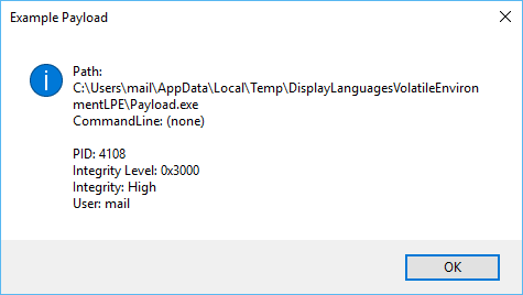 Our DLL is now executed with high IL. In this example, Payload.exe will be started, which is an exemplary payload file displaying a MessageBox.