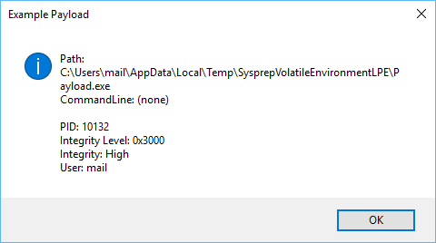 When everything worked correctly, Payload.exe should be executed, displaying basic information including integrity level.