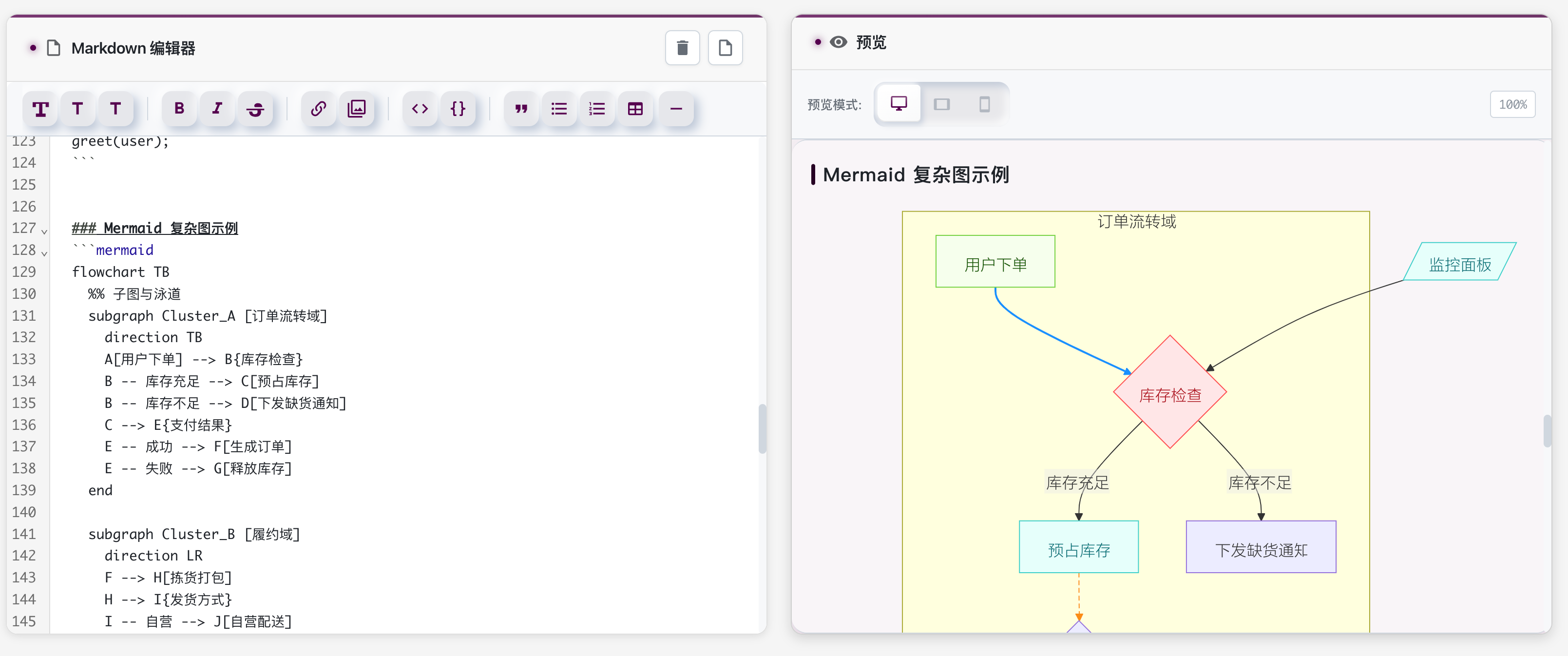 - 支持 Mermaid 节点视图;表格内反引号在少数场景做了兼容处理,确保展示与复制兼容。