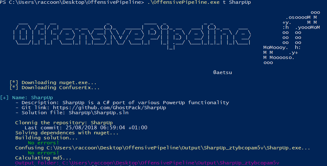 OffensivePipeline downloads the tool from the git repository, then compiles it with msbuild and finally obfuscates it with ConfuserEx.
