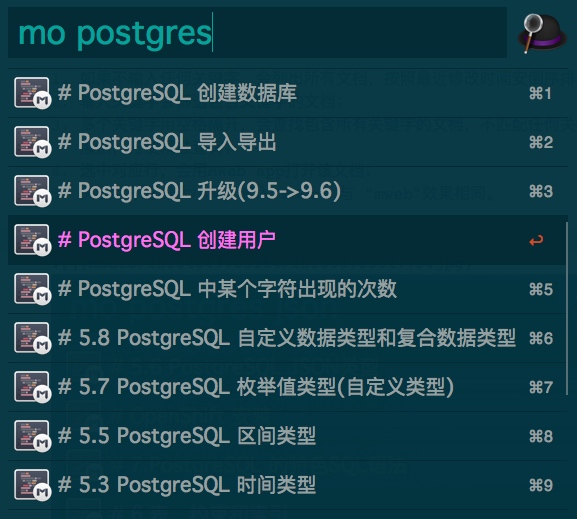 - 你可以输入多个关键字过滤,中间以空格隔开,workflow 会用查找包含所有关键的的文档,只有包含所有关键字的文档才会列出来,所以关键字越多越精确;