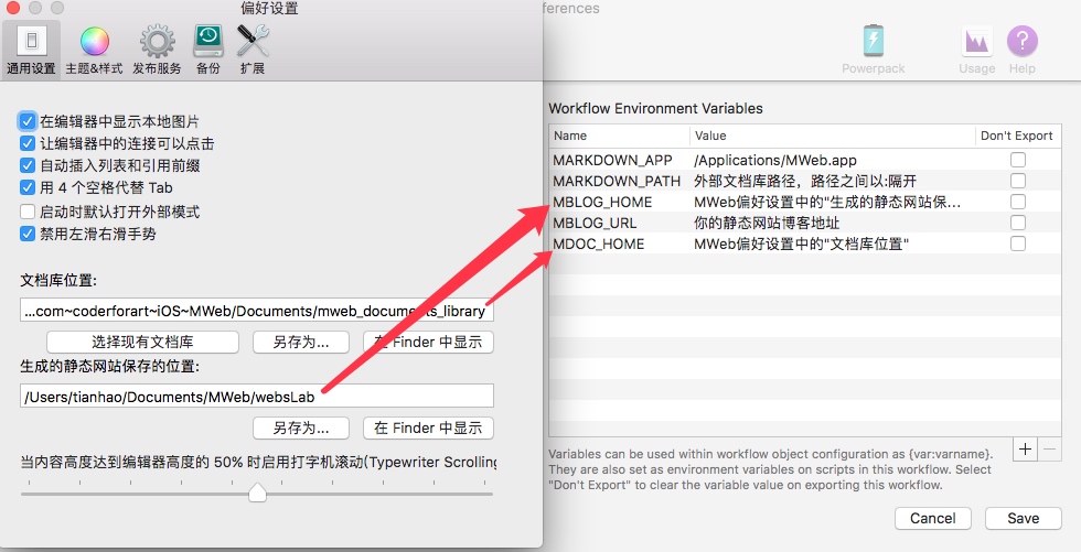 2.打开MWeb偏好设置,复制对应路径到workflow变量中