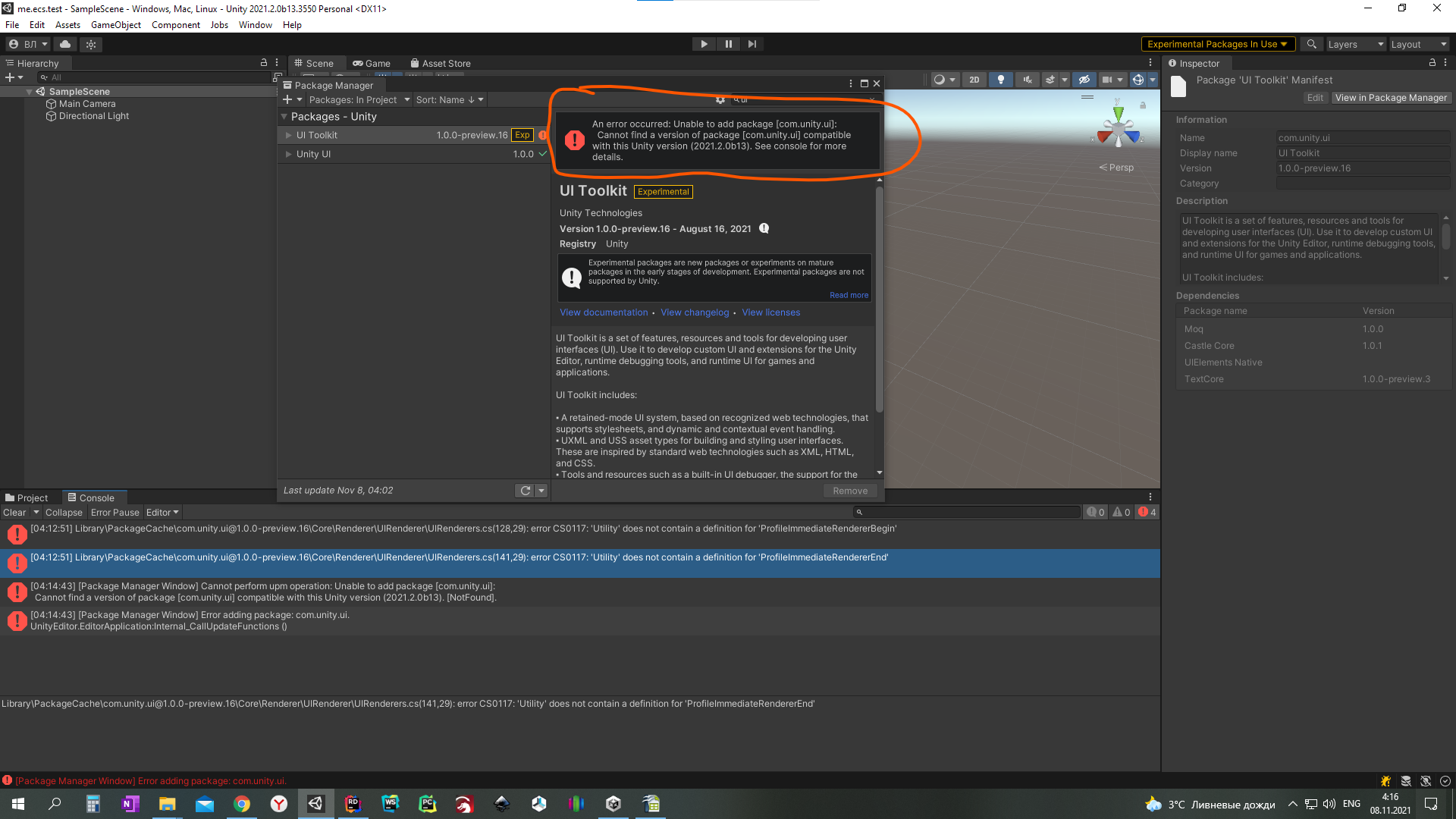 @valanchik I think this is because of beta version, why you not use stable one? Seems like you unity.ui package doesn’t work with unity beta version. May be you can use submodule installation instead of UPM installation, it should help.