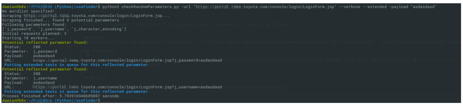 python3 checkRandomParameters.py -url "http://victim/" -payload '[XSS"]' -paramlist /path/to/params.txt -threads 10 -timeout 3600 --verbose --extended