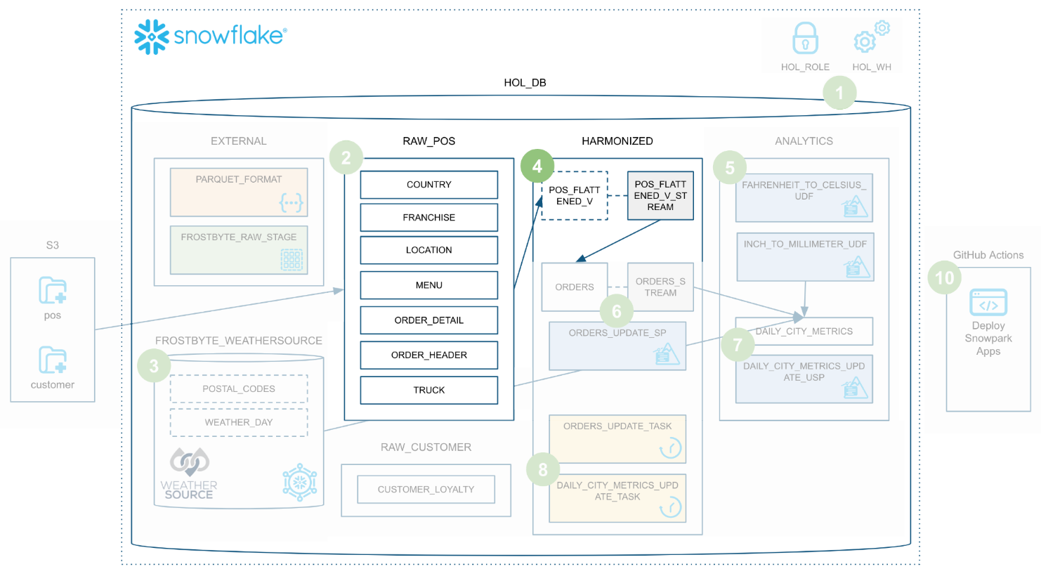 During this step we will be creating a view to simplify the raw POS schema by joining together 6 different tables and picking only the columns we need. What's really cool is that we're going to define that view with the Snowpark DataFrame API, then we're going to create a Snowflake stream on that view so that we can incrementally process changes to any of the POS tables. To put this in context, we are on step #4 in our data flow overview: