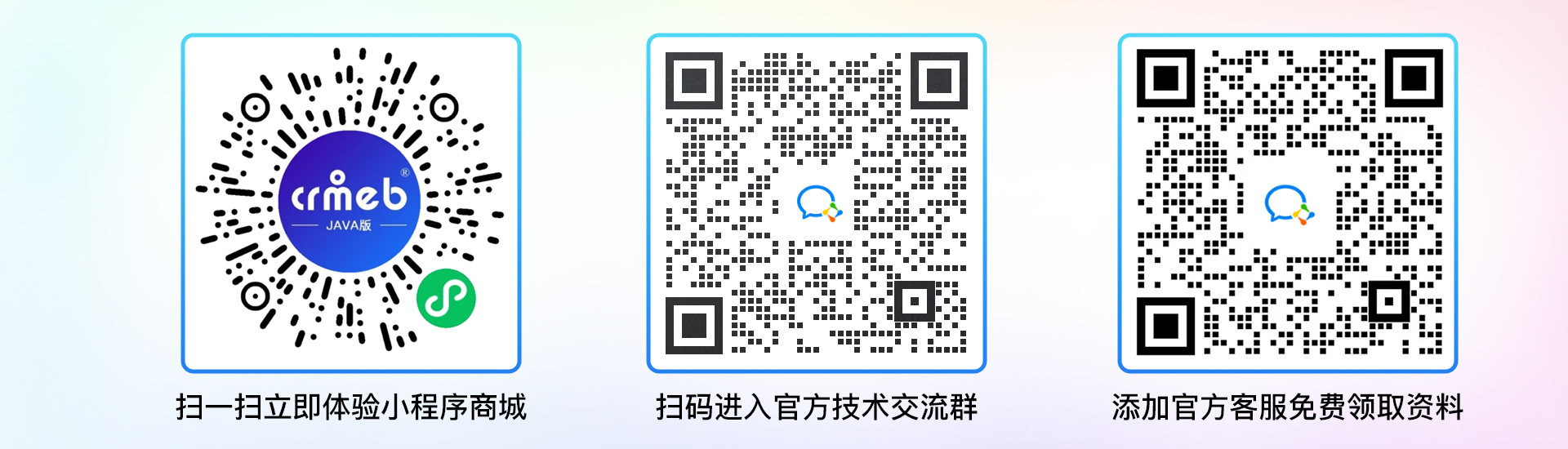 欢迎加入CRMEB开源技术交流群,扫码进群免费领取接口文档、功能清单、UI设计图、思维导图等资源!
