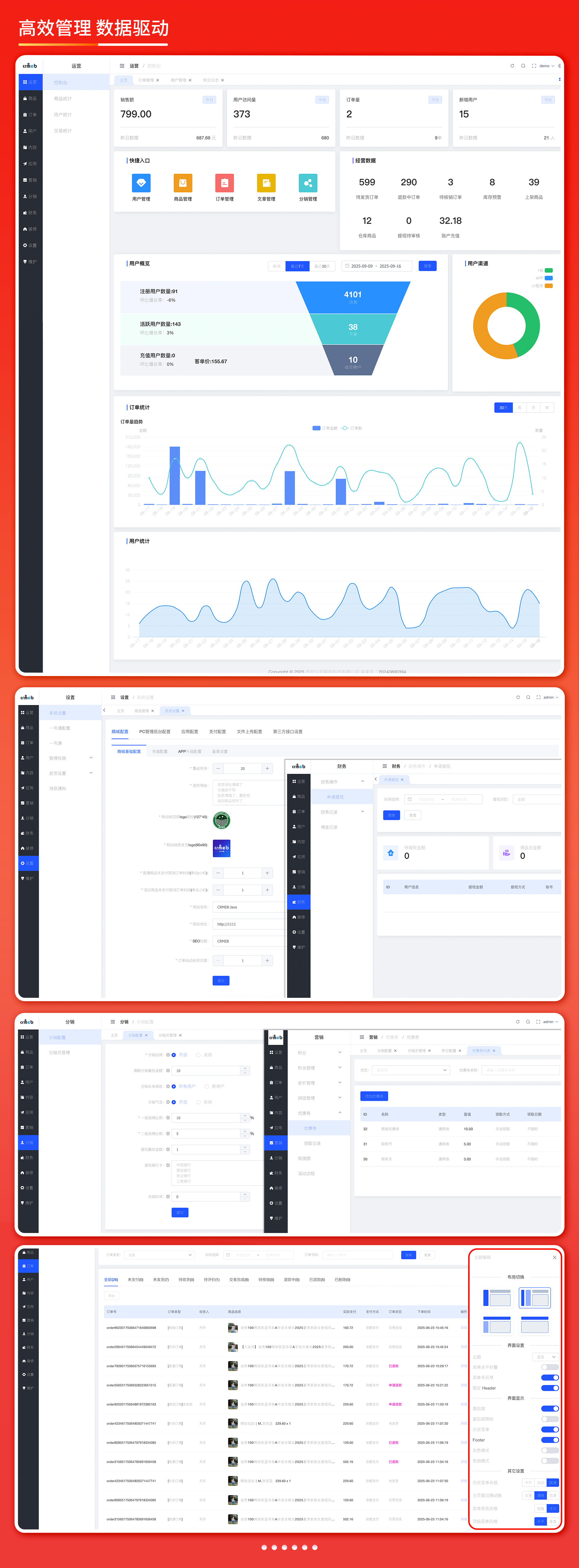 集成ECharts实现多维数据看板,支持订单、用户、资金等多维度统计分析,数据可导出,助力运营决策。