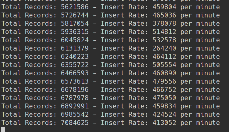 Currently averaging around 350K inserts/minute with these settings and table configuration in db/migrate/