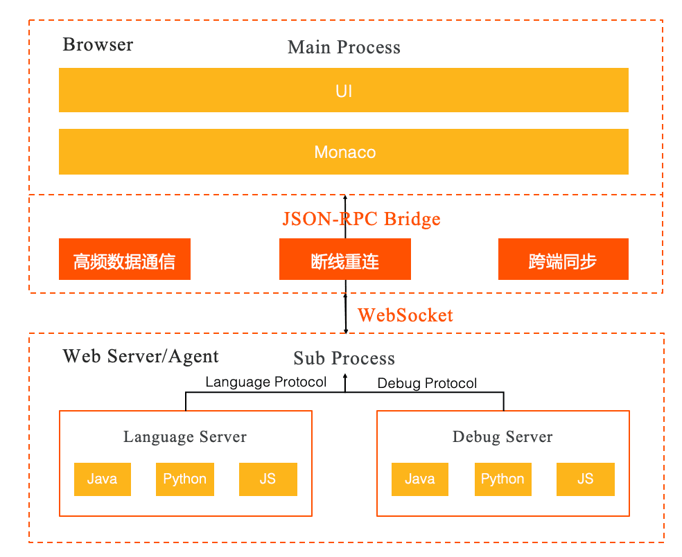 2.后端侧重实现 Lanuage Server 和 Dubug Server 语言解析和运行调试环境的功能