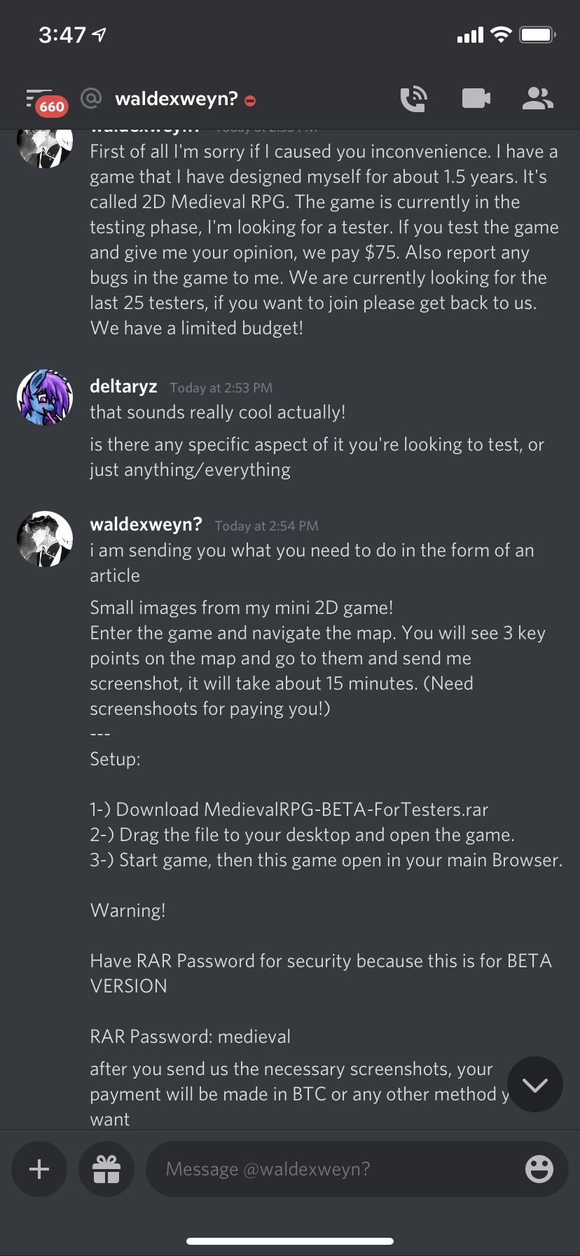 @naknode The rar included the entire git repo, including the readme. After I (foolishly, I'm a game developer ffs how could I do such a thing LOL) ran the exe nothing appeared to happen, so I checked the readme in case there were startup params I needed or something. And then I realized Discord also crashed (probably in an attempt to make me restart it so they could steal my login token) and started looking into the game, which was named Delaford.