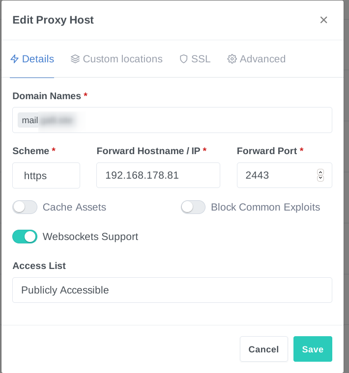 And finally within NPN, create the proxy host to use proxy host address IP address to the IP address of the server that is running the docker instance for Mailu, as well as set the port to match the above (in this instance 9443). Specifying the container name or using 127.0.01/localhost as the address will not work. As per your original screenshot, shown here: