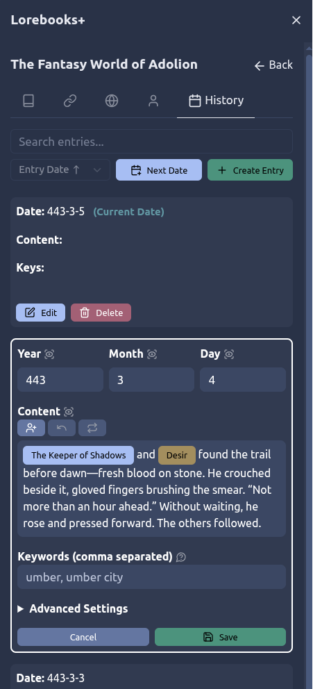 - ๐ Lorebooks+ features: custom calendars, "eras" historical categories, and more