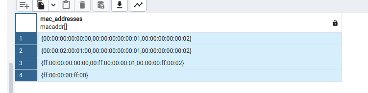 VALUES ( '{00:00:00:00:00:00, 00:00:00:00:00:01, 00:00:00:00:00:02}'::macaddr[] );In duckdb: