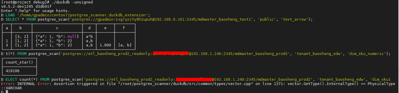 INTERNAL Error: Assertion triggered in file "/root/postgres_scanner/duckdb/src/common/types/vector.cpp" on line 1371: vector.GetType().InternalType() == PhysicalType::VARCHAR