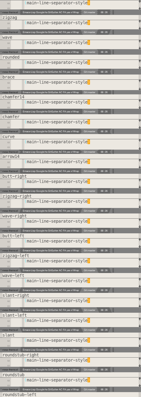 Note: Mainline is being merged with the other active fork of Powerline - The new separators and serveral new ones have been added already. I will be retiring emacs-mainline in light of this, and 1.2.8 is likely the final release. I suggest you switch over to Powerline if you are using main-line currently.