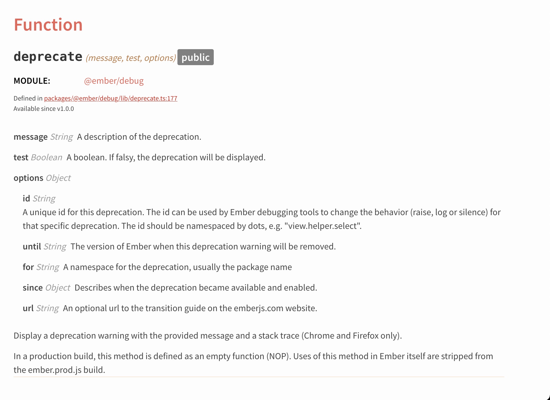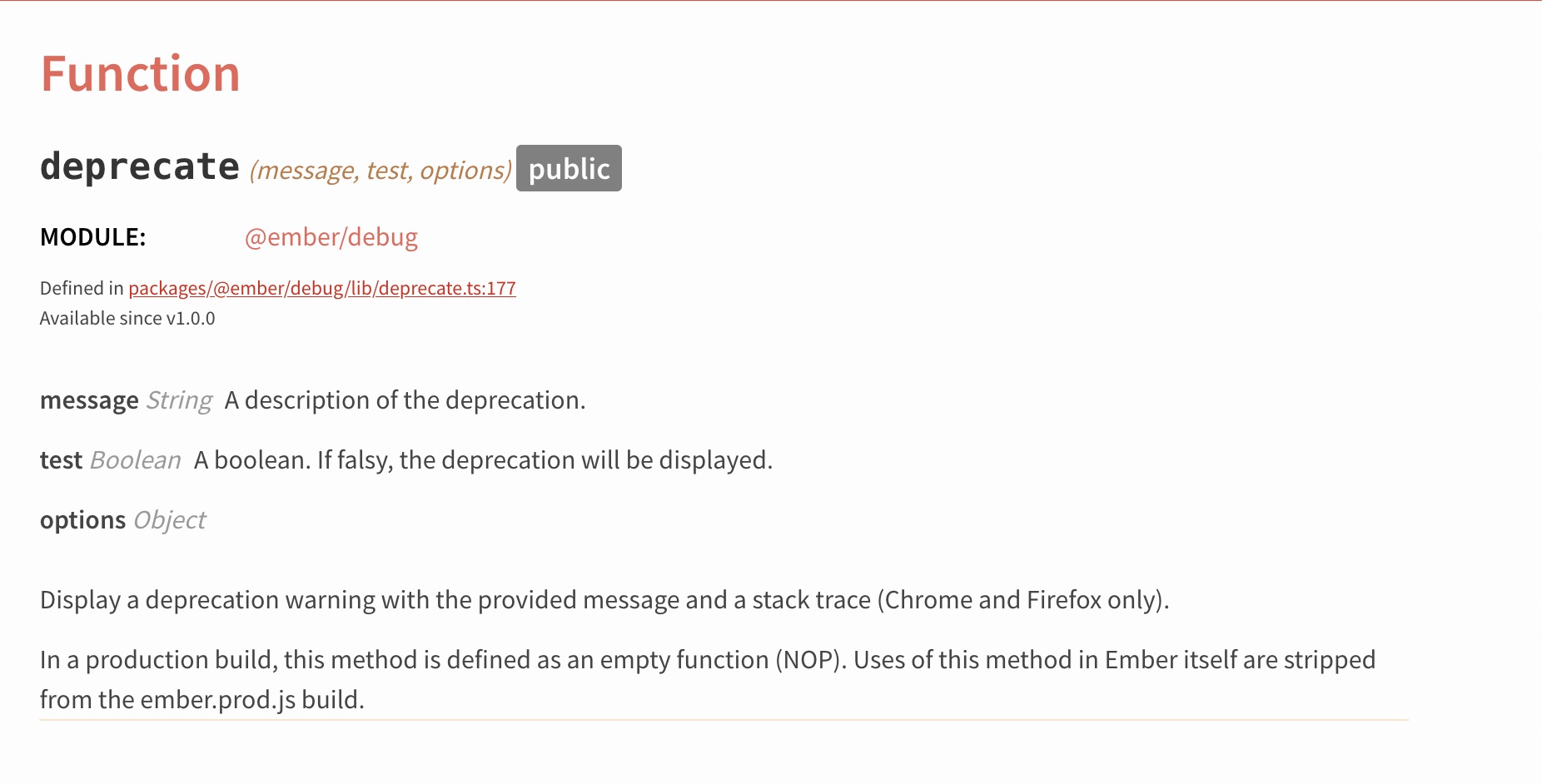 One example is the deprecate method. I often forget what the options are and which of them are required. The current docs don’t show them, but they are documented in the source. I'm not sure if there are any more examples like this.
