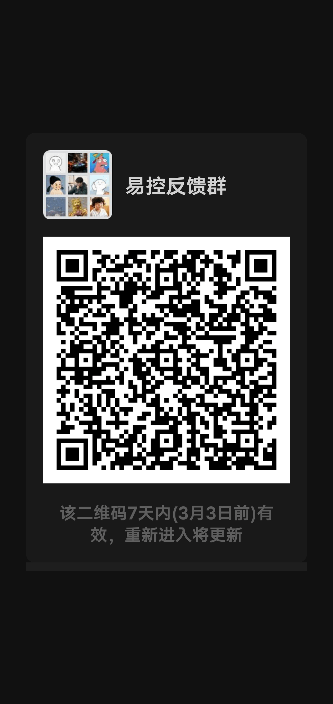 请在Github或Gitee提出Issue,或进入易控反馈群反馈BUG或建议。