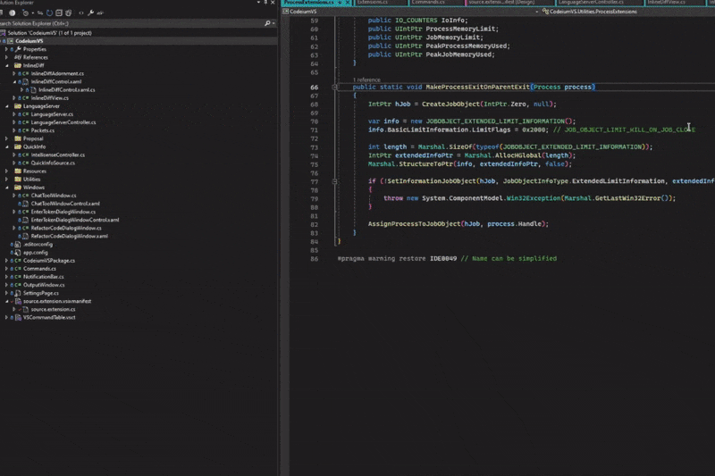 Codeium.slnand press CTRL+B to build, if there were no errors, there should be aCodeium.vsixfile in theCodeiumVS/binfolder. - You can press F5 to debug the extension on a separate instance of Visual Studio. Consult the official guide for more information.