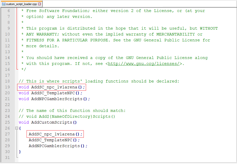 2. Add 1v1 arena script to TrinityCore\src\server\scripts\Custom\ custom_script_loader.cpp