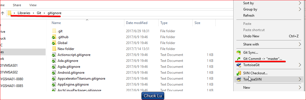 The default path showed is Librarie-->Git-->gitignore