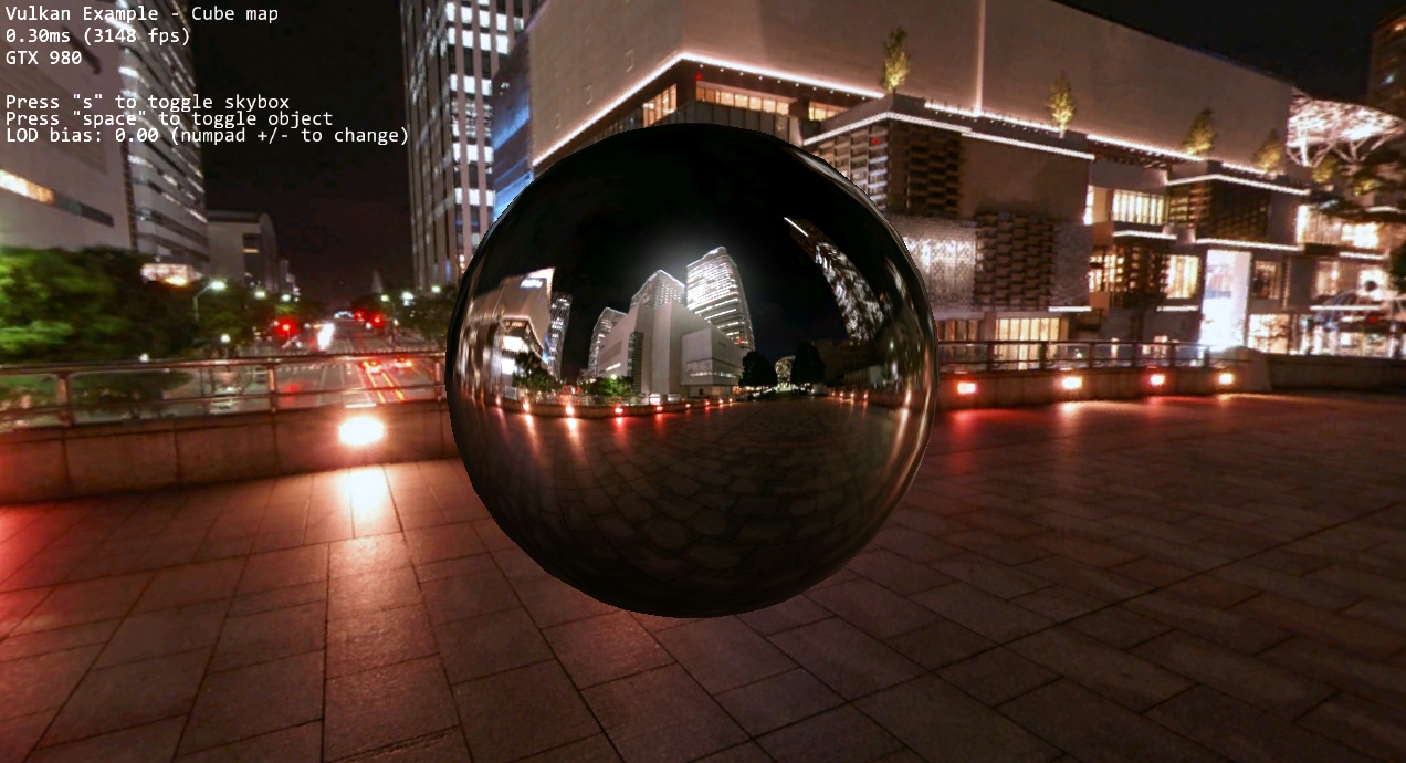 The demo then uses two different pipelines (and shader sets) to display the cubemap as a skybox (background) and as a source for reflections.