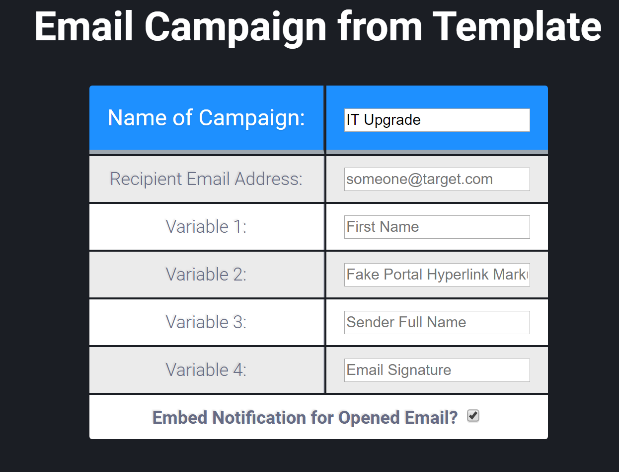 Next time, choosing the existing template will dynamically provide input fields for the stored variables. They can be applied in real time using JavaScript to update the email body. Checking the "Embed Notification for Opened Email" box will automatically append invisible code to your template that will alert you when your recipient opens their email. (Images must be allowed to render for this to work)