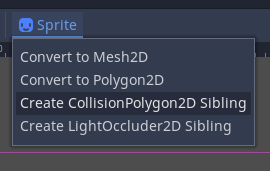 Hey there @Calinou, there is an option to convert just the sprite texture to a collision object, as you showed, but this implementation includes live updates to the sibling when the properties of the Sprite change (in-editor and with the ability to trigger regeneration at runtime), as well as adding the ability to add space (padding) to the collider around the sprite's shape.