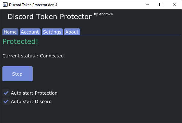 Your Discord token is stored in a secure container encrypted with AES-256.