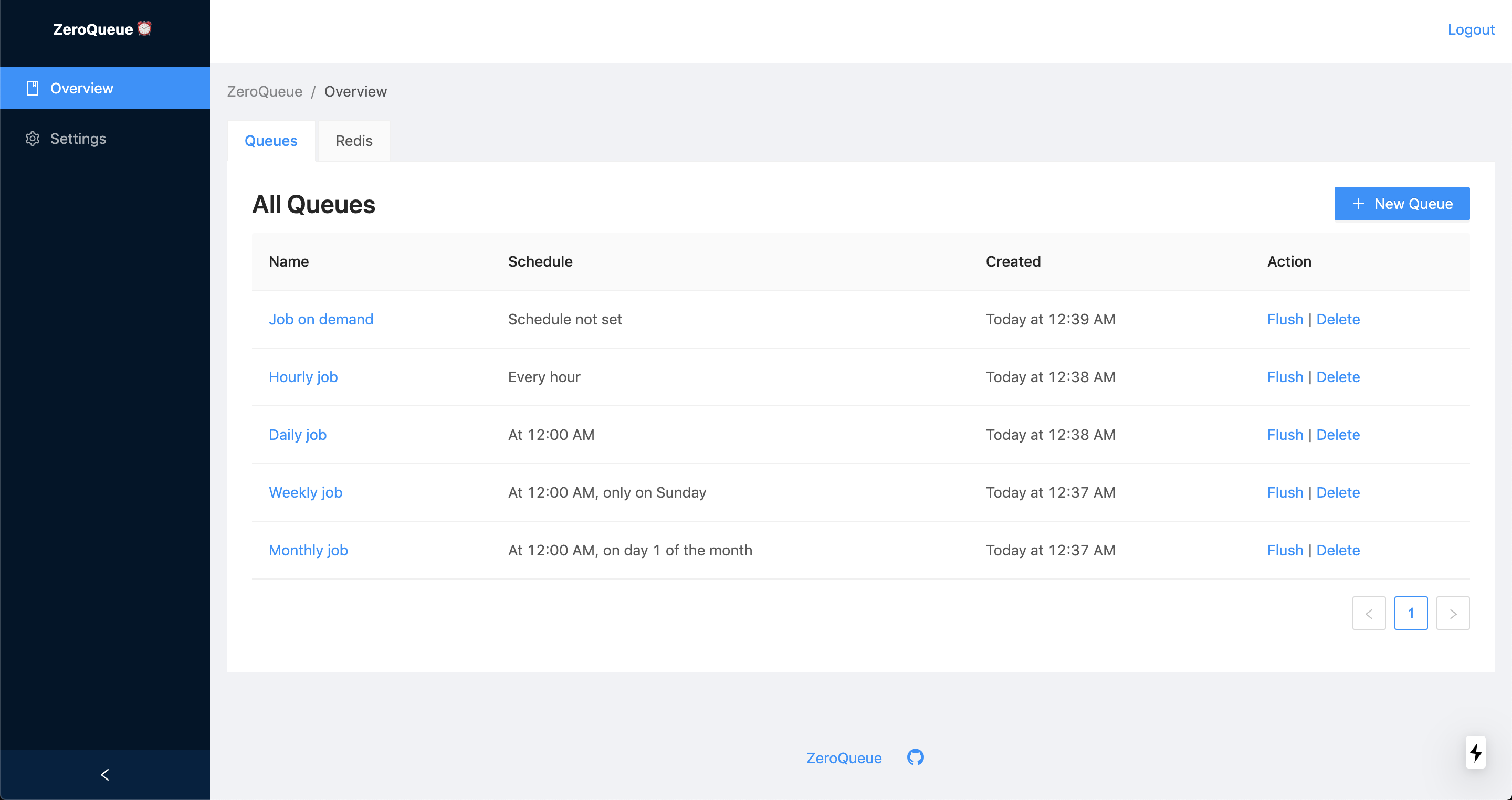 Each zeroqueue instance has many queues and each queue has many jobs with a different status.