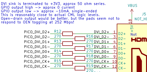 The Rev A board uses a slightly cursed coupling circuit I first saw (and used) on the ULX3S FPGA board, which just connects 3V3 IOs straight into the HDMI socket through some coupling caps.