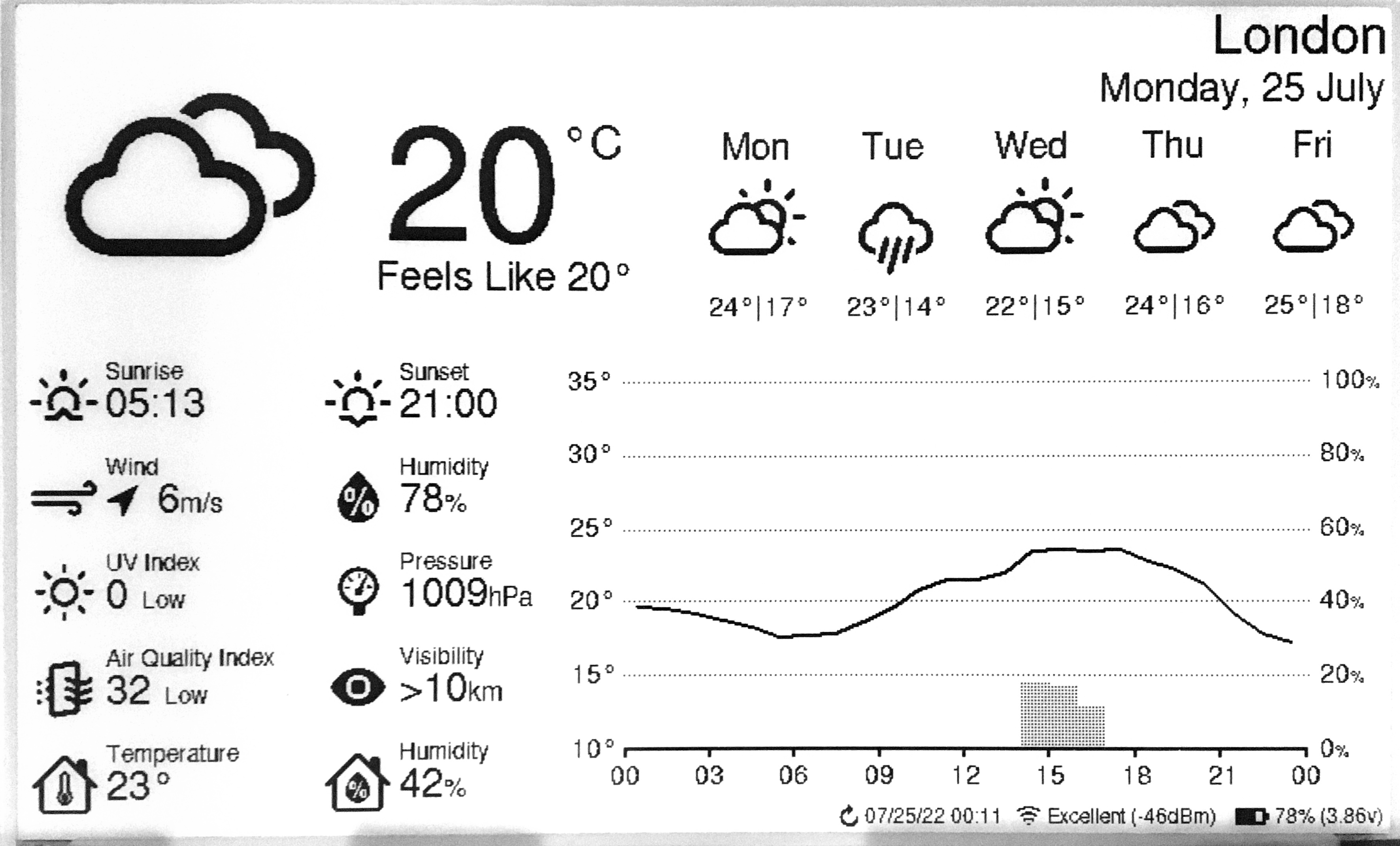 This is a weather display powered by a wifi-enabled ESP32 microcontroller and a 7.5in E-Paper (aka E-ink) display. Current and forecasted weather data is obtained from the OpenWeatherMap API. A sensor provides the display with accurate indoor temperature and humidity.