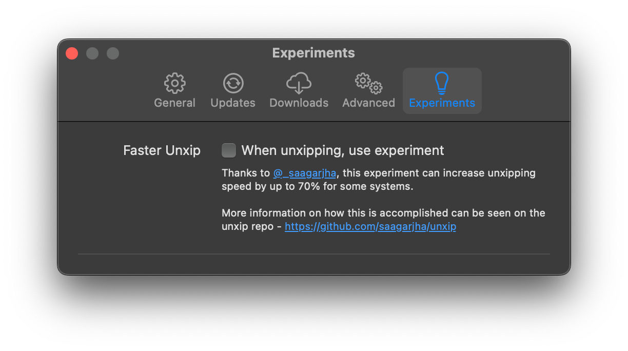 - Thanks to the wonderful work of https://github.com/saagarjha/unxip, turn on the experiment to increase your unxipping time by up to 70%! More can be found on his repo, but bugs, high memory may occur if used.