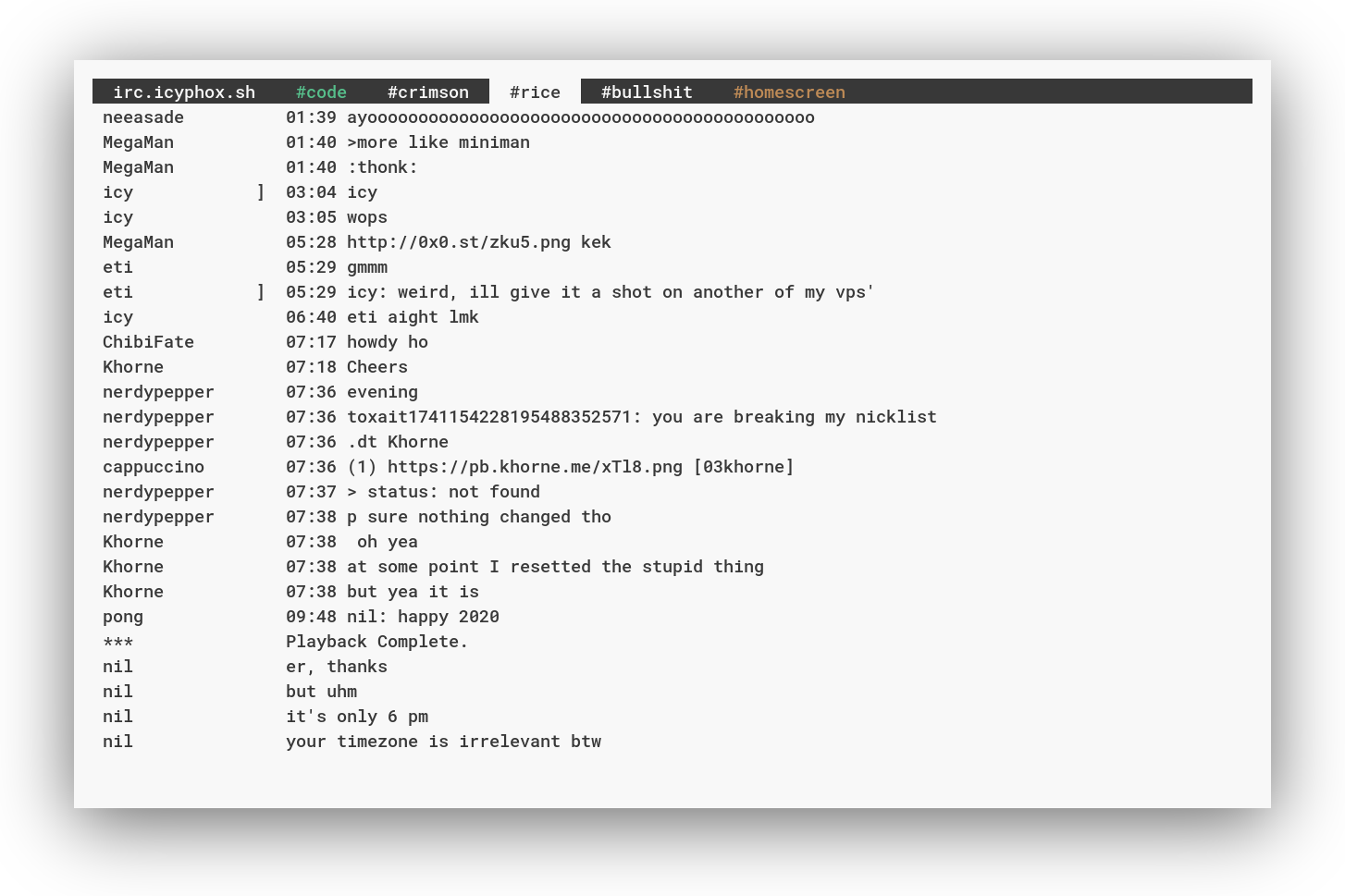 /j #channel— Join channel/l #channel— Leave channel/me msg— ACTION/q user msg— Send private message/r something— Send raw command/x— Quit