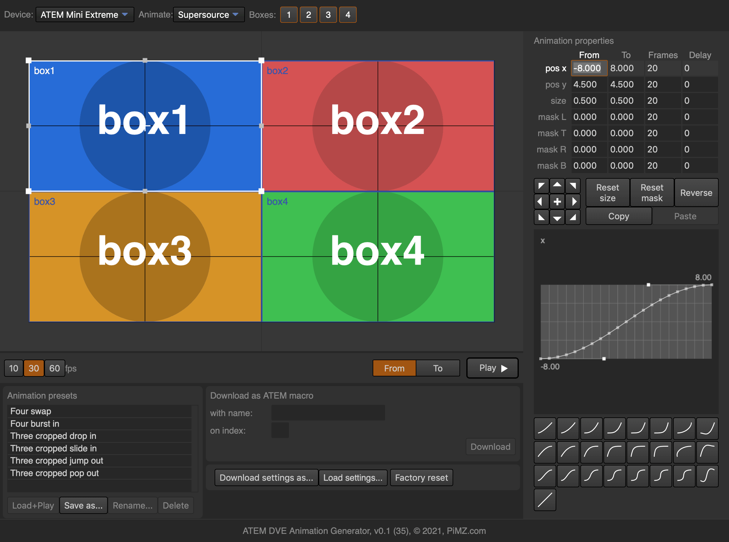 It's a two-keyframe animation tool for ATEM series switchers. It animates (DVE) keyers or Supersource boxes. The animations themselves run on the switcher through macro's that the tool exports.