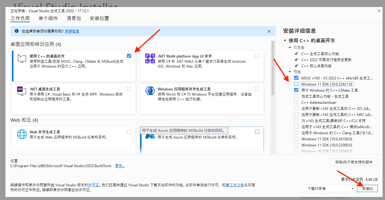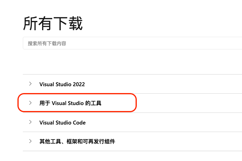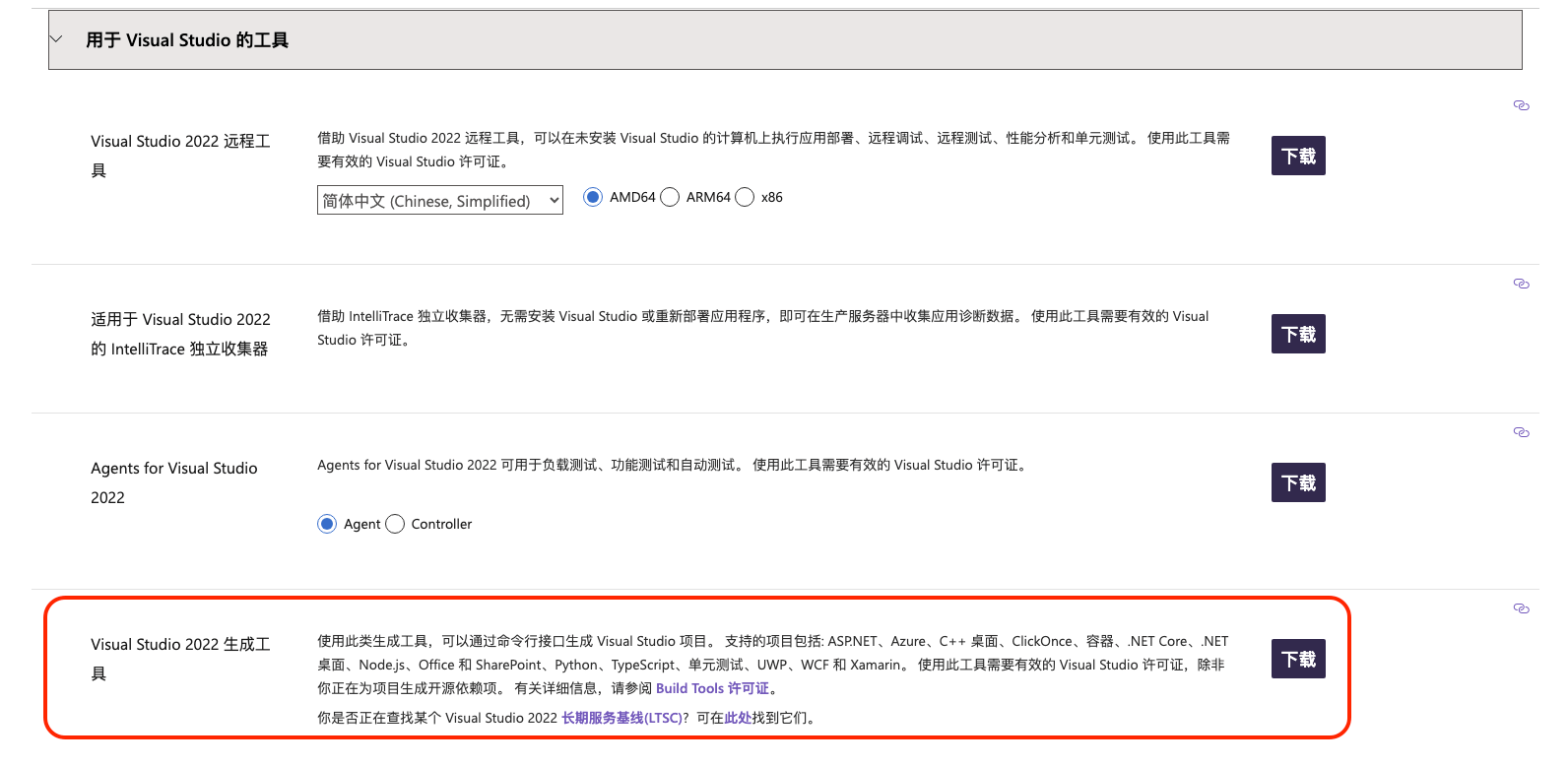 - 安装Visual Studio 生成工具。首先打开官网,下拉网页找到“用于Visual Studio的工具”。展开后找到“Visual Studio 2022 生成工具”下载安装。