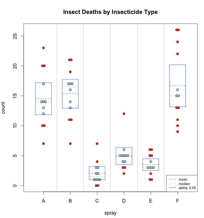 dotchartdf(InsectSprays, "spray", "count", "Insect Deaths by Insecticide Type")