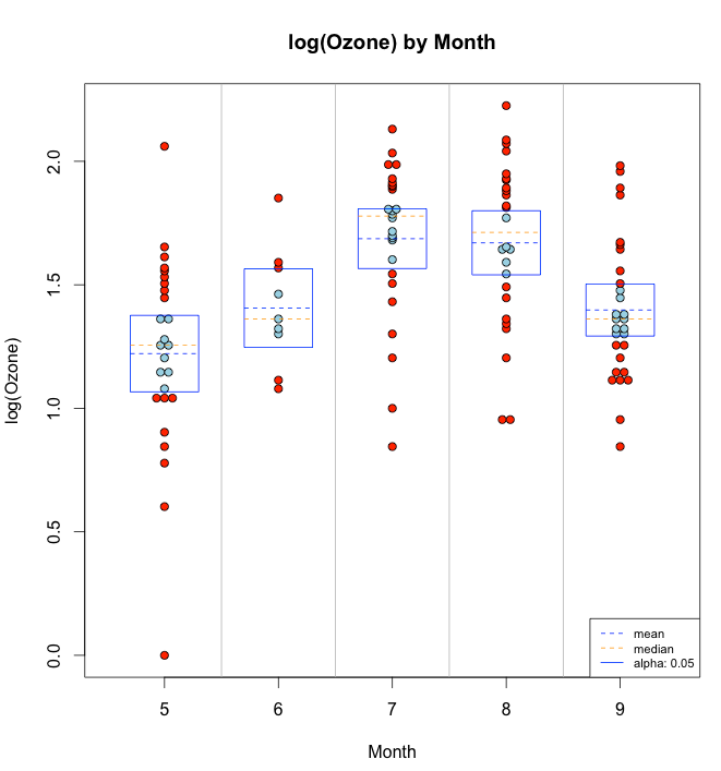 dotchartdf(airquality, "Month", "Ozone", "Ozone by Month", alpha=0.01, log=TRUE)