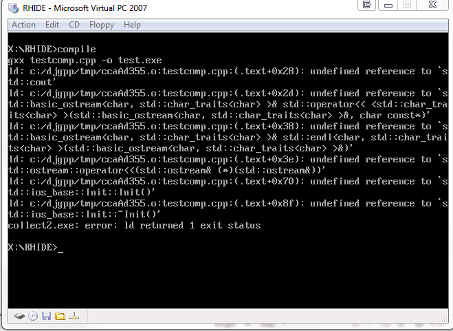 but now I have some linker errors, when trying to compile sample C++ HelloWorld (one that configure.pl in TurboVision uses to check for C++ compiler )