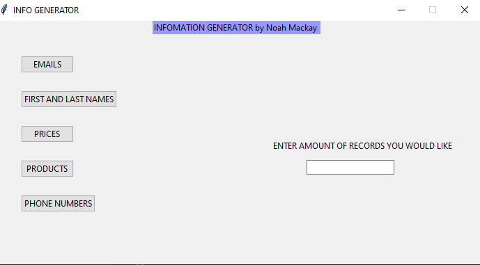An generator built to provide test data. Currently supported data are (Email , products with prices, phone Numbers , prices and first and last names)