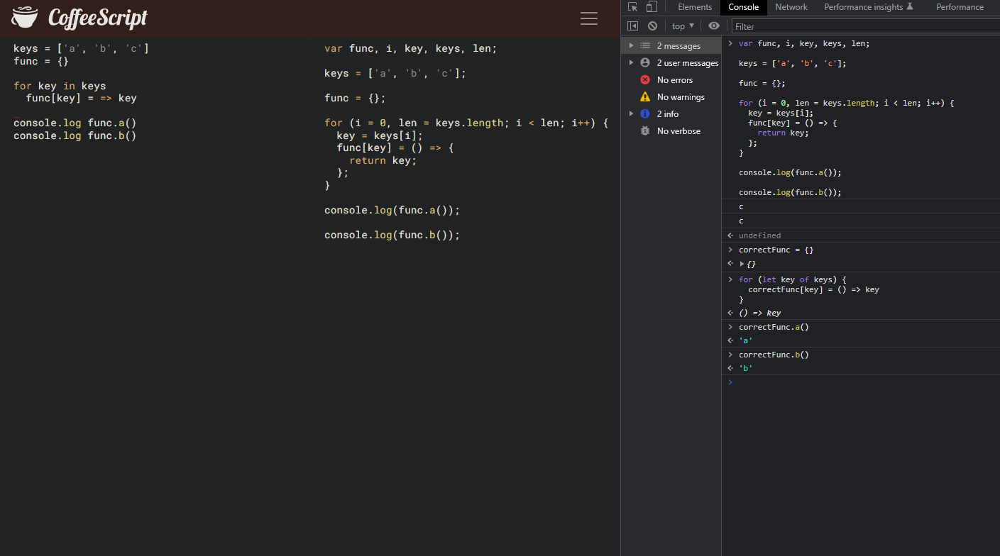 Here’s a screenshot demonstrating some sample CS code, its translation to JS, and the log showing the incorrect (for me) behavior, along with the correct one:
