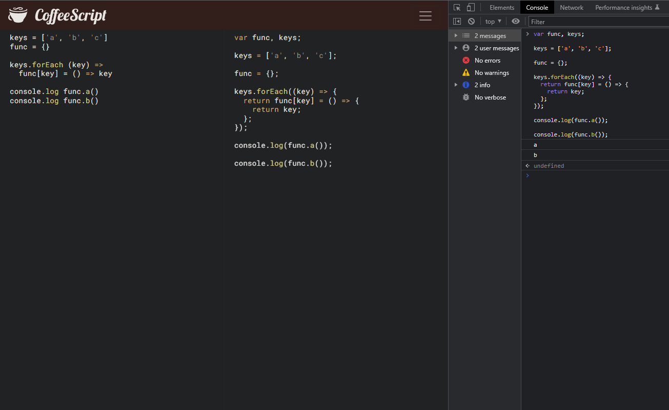 console.log func.b()I want a behavior where it logs the key that the function was created with, not the last key assigned (because coffescript seems to be assigning to global variables).