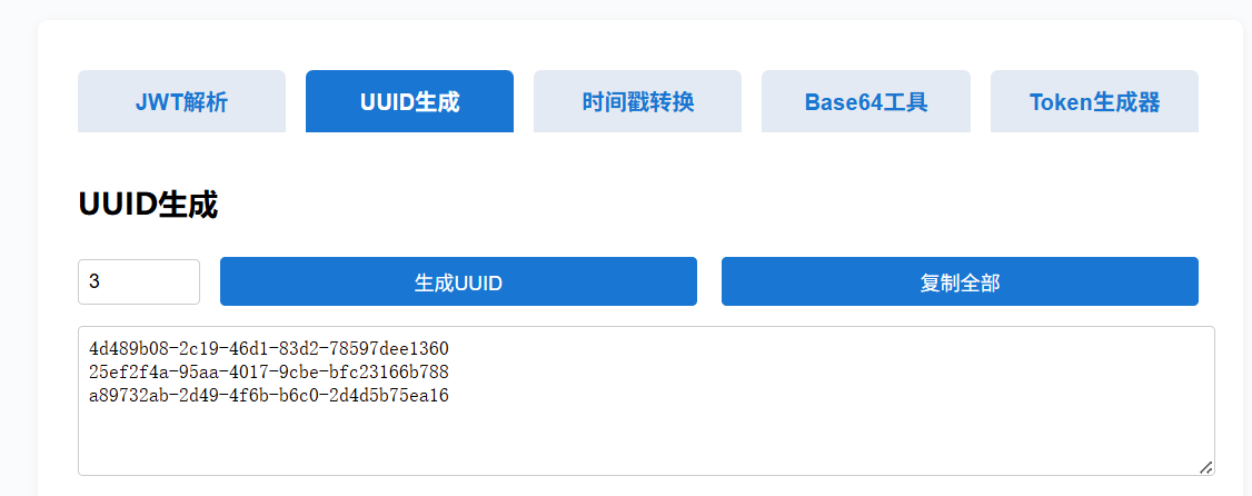 - UUID生成:支持生成标准 UUID,方便接口测试与数据填充。