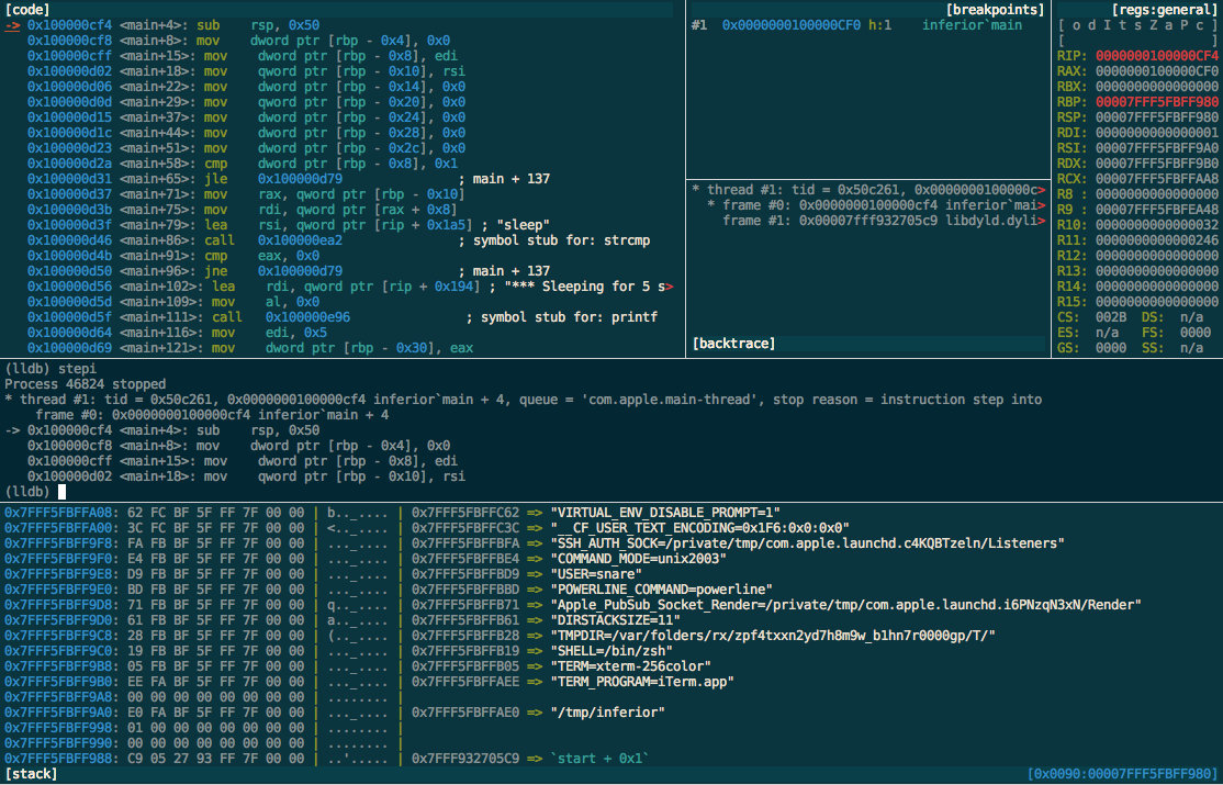 .lldbinitfor LLDB or.gdbinitfor GDB) configure it to load Voltron when it starts by sourcing theentry.pyentry point script. The full path will be inside thevoltronpackage. For example, on OS X it might be /Library/Python/2.7/site-packages/voltron/entry.py. If you don't add this to your init script, you'll need to execute the commands after starting your debugger.LLDB: